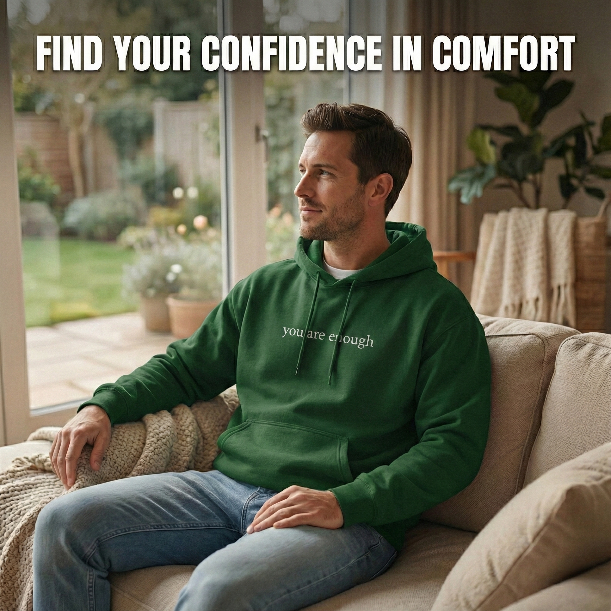 This hoodie won't fix that. But it puts something else in front of your eyes first. Two words on your chest. Before the voice gets a chance. Maybe it helps. Maybe it doesn't. But it's something.
