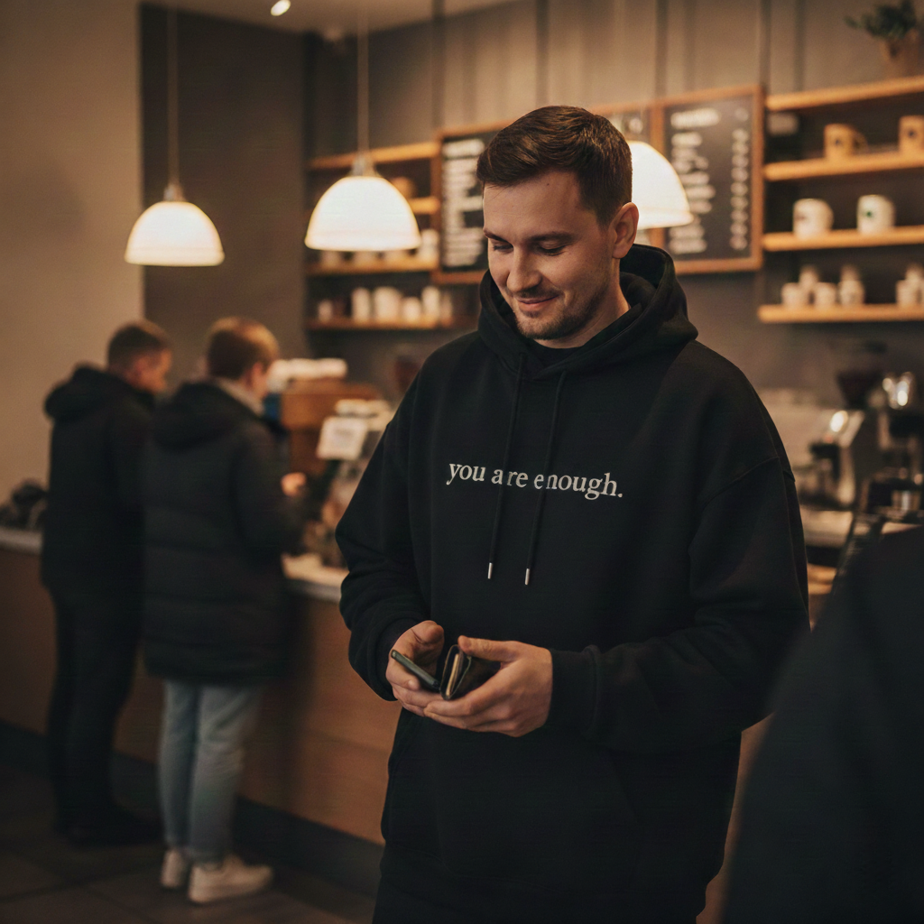 Anonymous / 30y 22 NOV. 2025Verified BuyerGot me through a breakup."She left three weeks ago. Every morning I wake up and my brain immediately starts. You're not enough, that's why she left, you'll always be alone. This hoodie doesn't make that stop. But it gives me something else to read first. Some mornings that's all I need."Was this helpful? 31 1